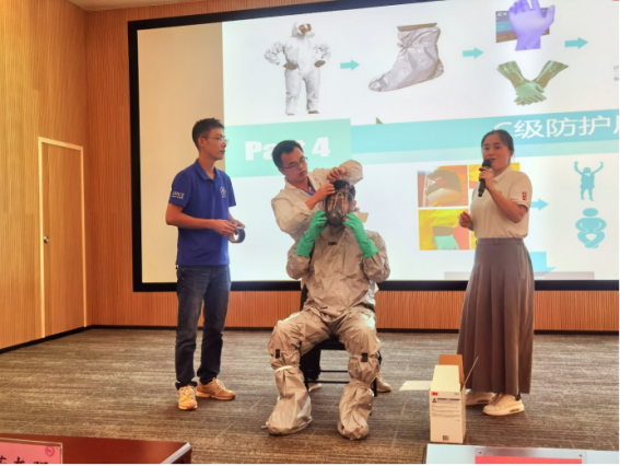 实验中心肖志明主任亲自为大家示范C级防护服穿戴
