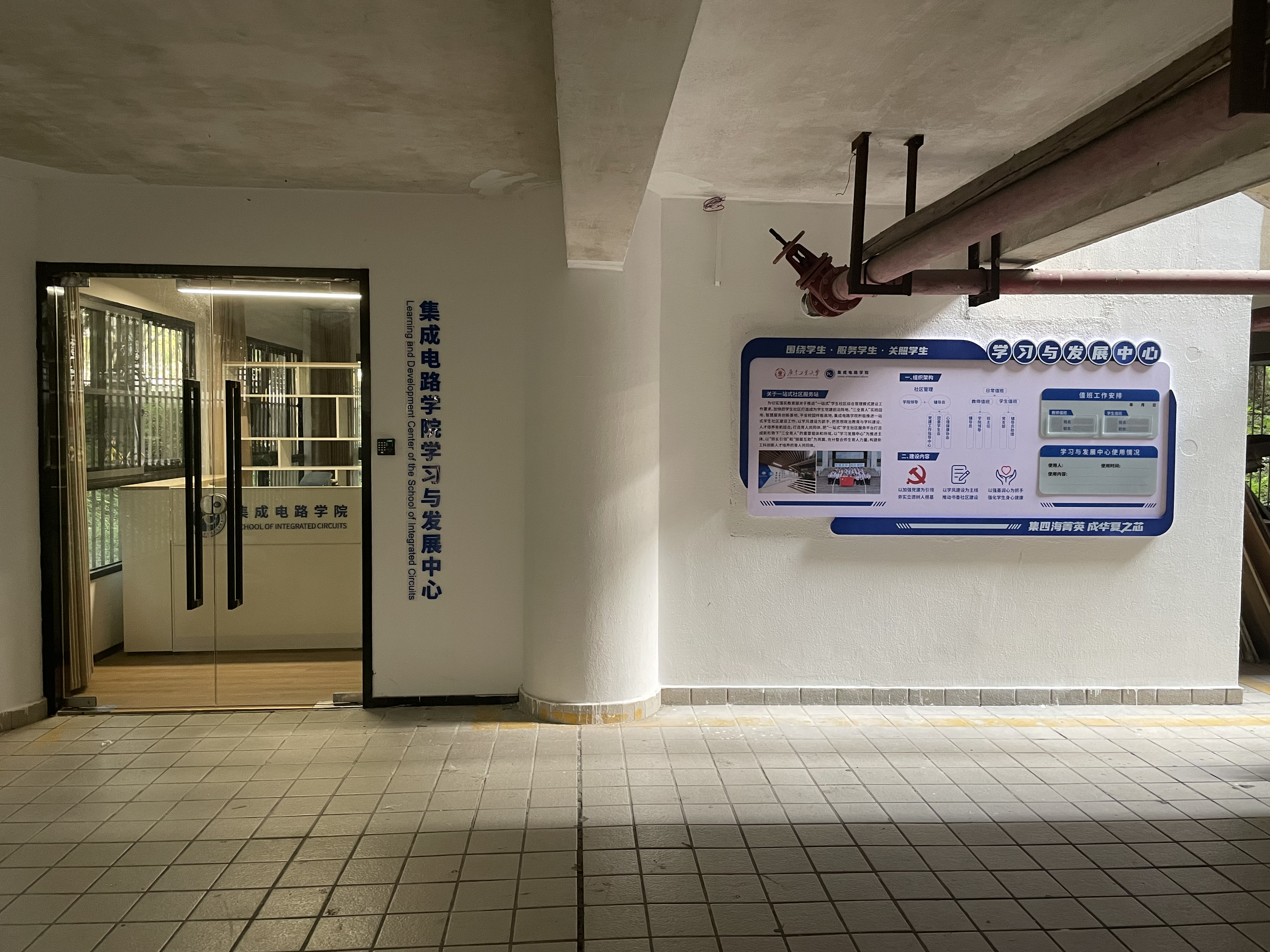 学生社区学习与发展中心坐落于大学城校区东—4号楼首层东面。中心按学生预约时间开放,设置有辅导员、学生党员、楼长或层长值班,每月均有院班子成员定时值班。