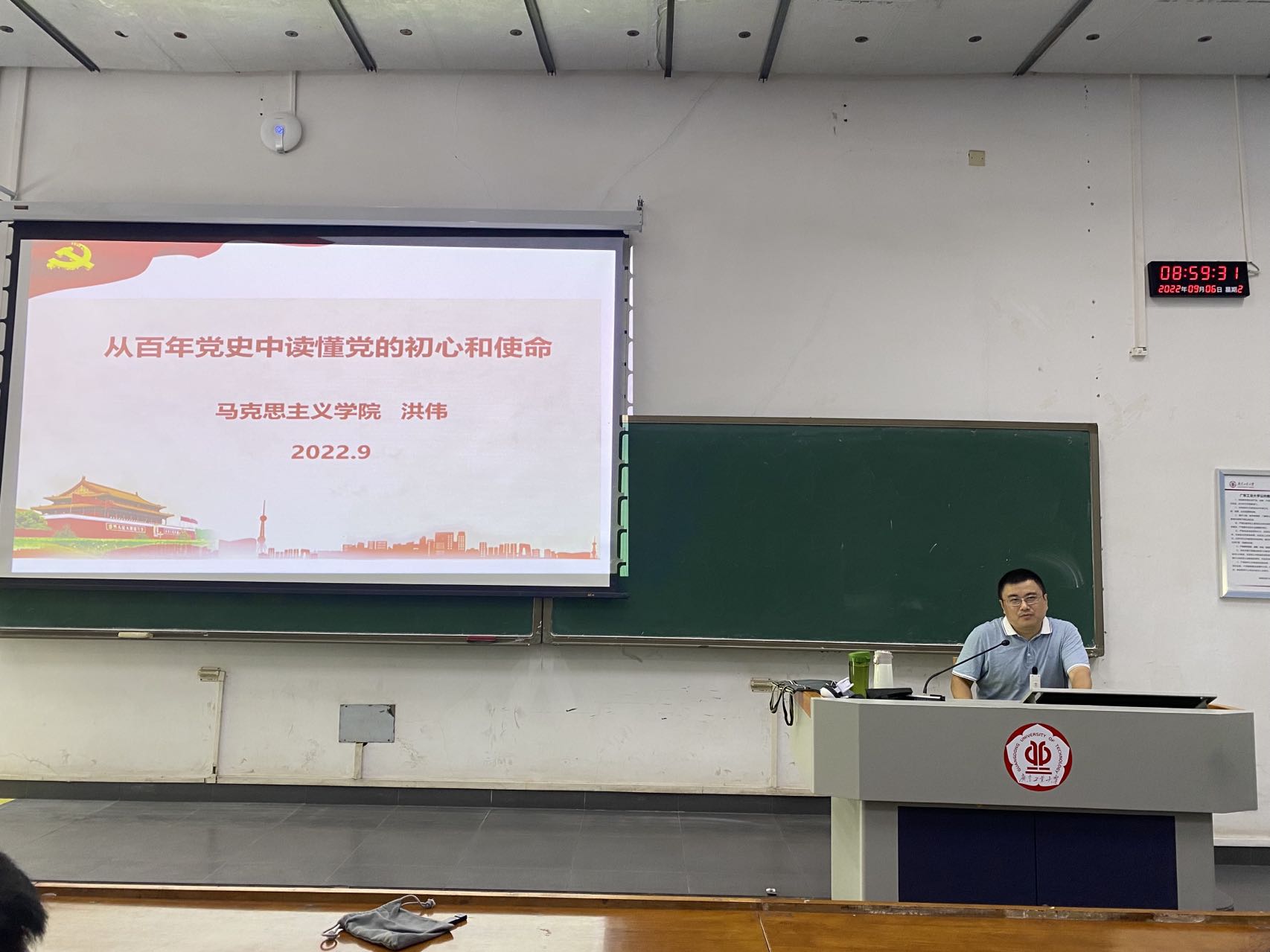 洪伟老师作了主题为“从百年党史中读懂党的初心和使命”的分享,围绕“忆峥嵘岁月溯建党初心”、“从百年党史中汲取成长的力量”、“在全面建设社会主义现代化国家新征程中展现当代青年的使命和担当”三个方面,回顾了中国共产党的奋斗历程来探寻党“全心全意为人民服务”的初心和信仰,讲述了百年党史蕴含的无穷智慧和力量,号召大学生要树立崇高的理想,主动投身国家的建设中。