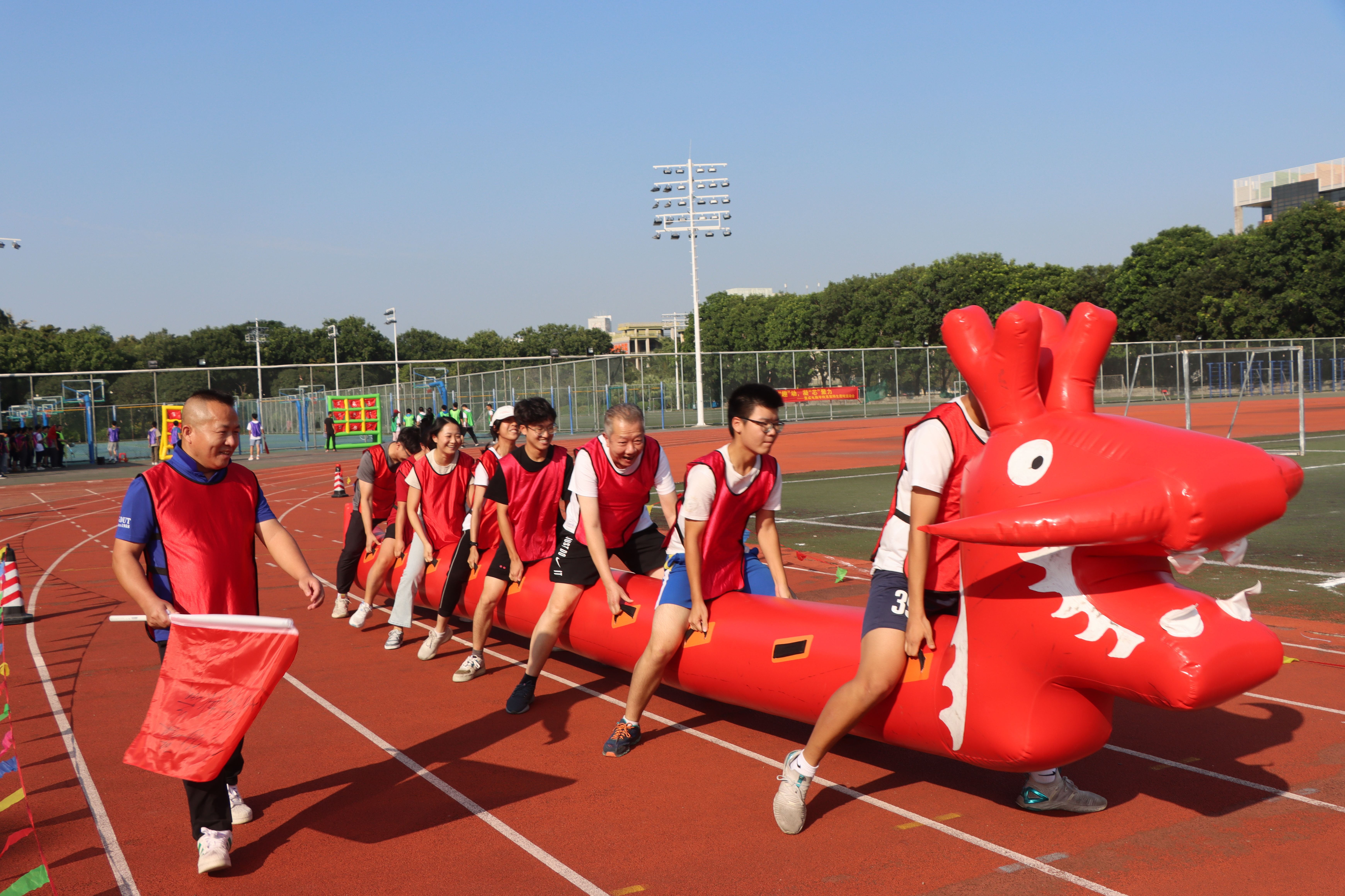 随着口哨响起,由师生共同组成的参赛队伍手持队旗,齐齐上阵,争分夺秒展开竞技,助威呐喊声回荡在操场上。本次趣味运动会设置了旱地龙舟、足球九宫格、砥砺奋进和拔河等比赛项目。