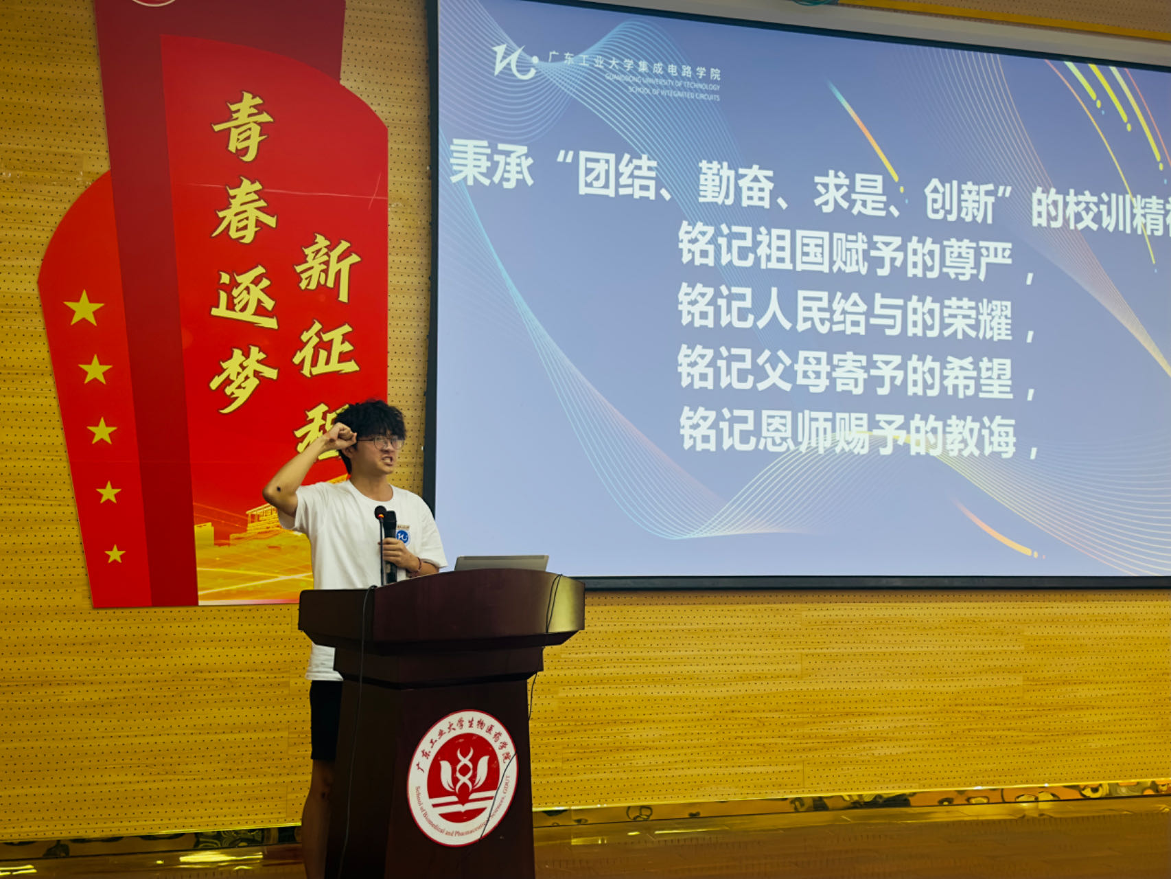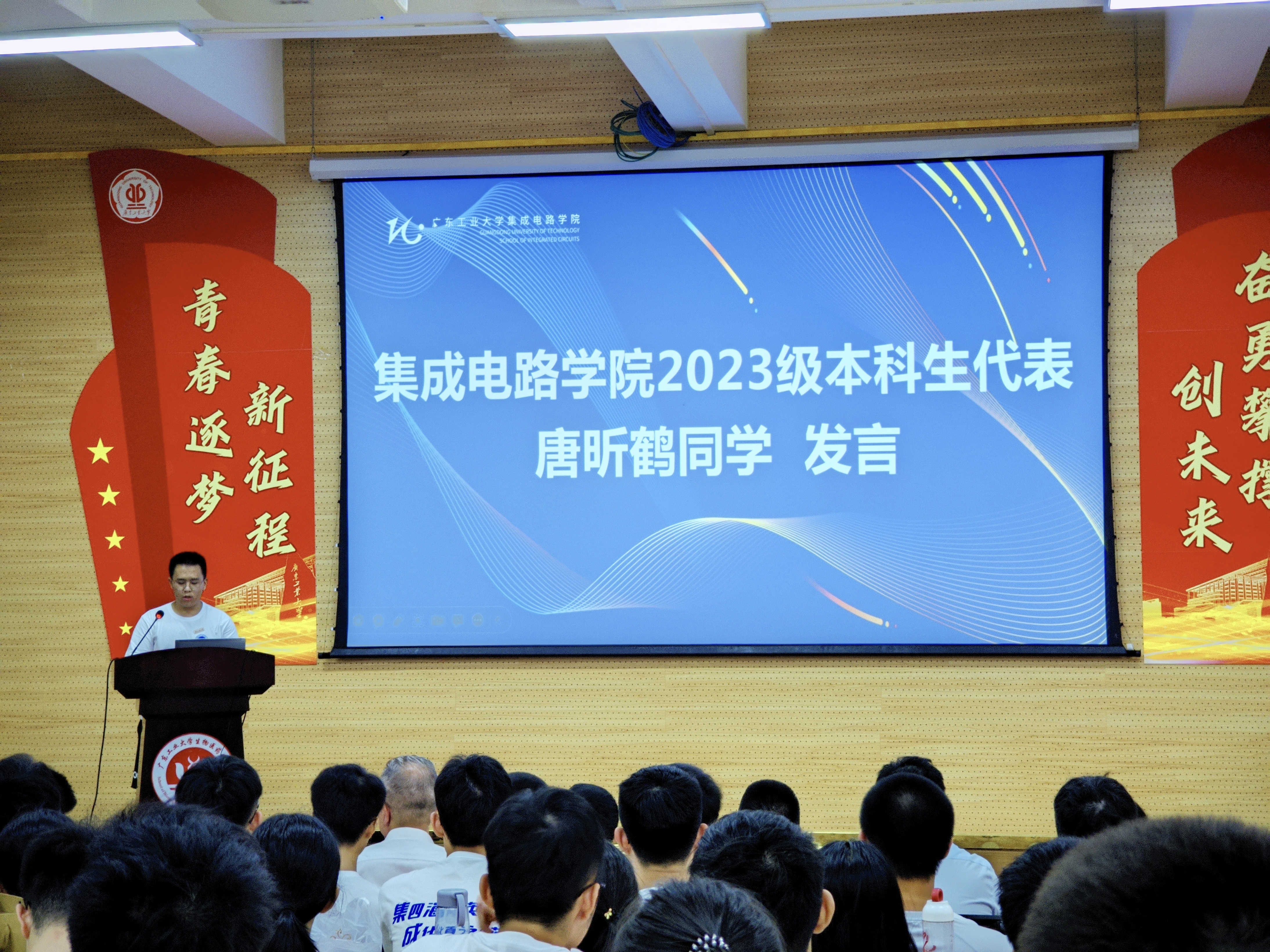 叶志聪同学作为研究生代表发言,他通过分享自身经历勉励同学们,要“坚守初心,不懈奋斗”,要有“国际视野,家国情怀”,要“脚踏实地,循序渐进”,要“尊师爱友,敬业乐学”,要“内强素质,外塑体魄”,最终为我国集成电路行业的发展贡献青春力量。