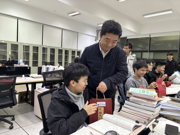 党委副书记石宇杰、毕业班辅导员郭汶林以及学生代表们为全力备战的考研学子们送上满载祝福与关怀的考研礼包。