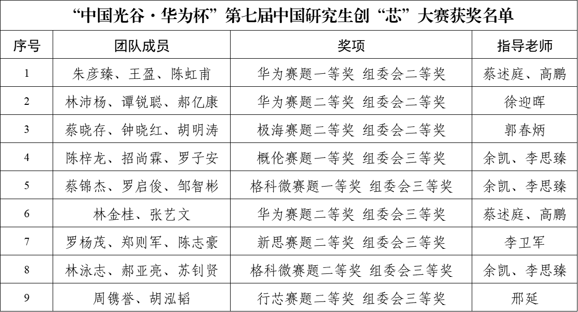 8月14日至16日,“中国光谷·华为杯”第七届中国研究生创“芯”大赛决赛在华中科技大学举行。我校参赛队伍精心准备,沉着应战、表现出色。经过三天的比赛评审、激烈角逐,我校队伍荣获国赛二等奖3项,三等奖6项;同时获得企业赛道:华为赛题一等奖1项、二等奖2项,极海赛题二等奖1项,概伦赛题一等奖1项,格科微赛题一等奖1项、二等奖1项,新思赛题二等奖1项,行芯赛题二等1项,刷新了我校在该赛事的最好成绩。我校获优秀组织奖。
