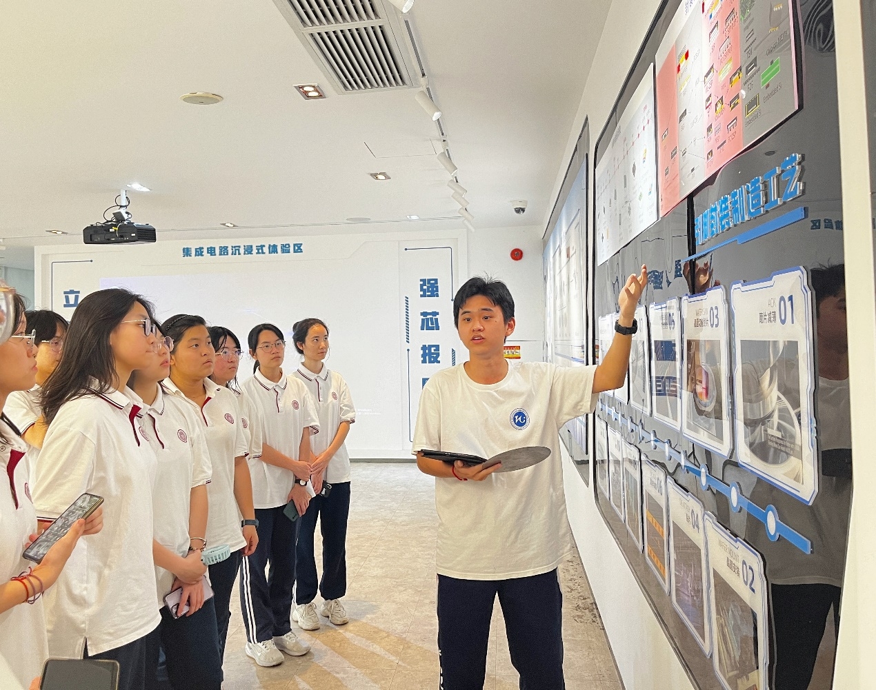 “芯火”宣讲团带领师生们参观了近期获批的广东省科普教育基地——集成电路专业认知体验馆,从集成电路的发展历史、制造、封装测试、发展前景等方面为他们进行了详细的科普讲解,同学们对集成电路有了初步的认识。