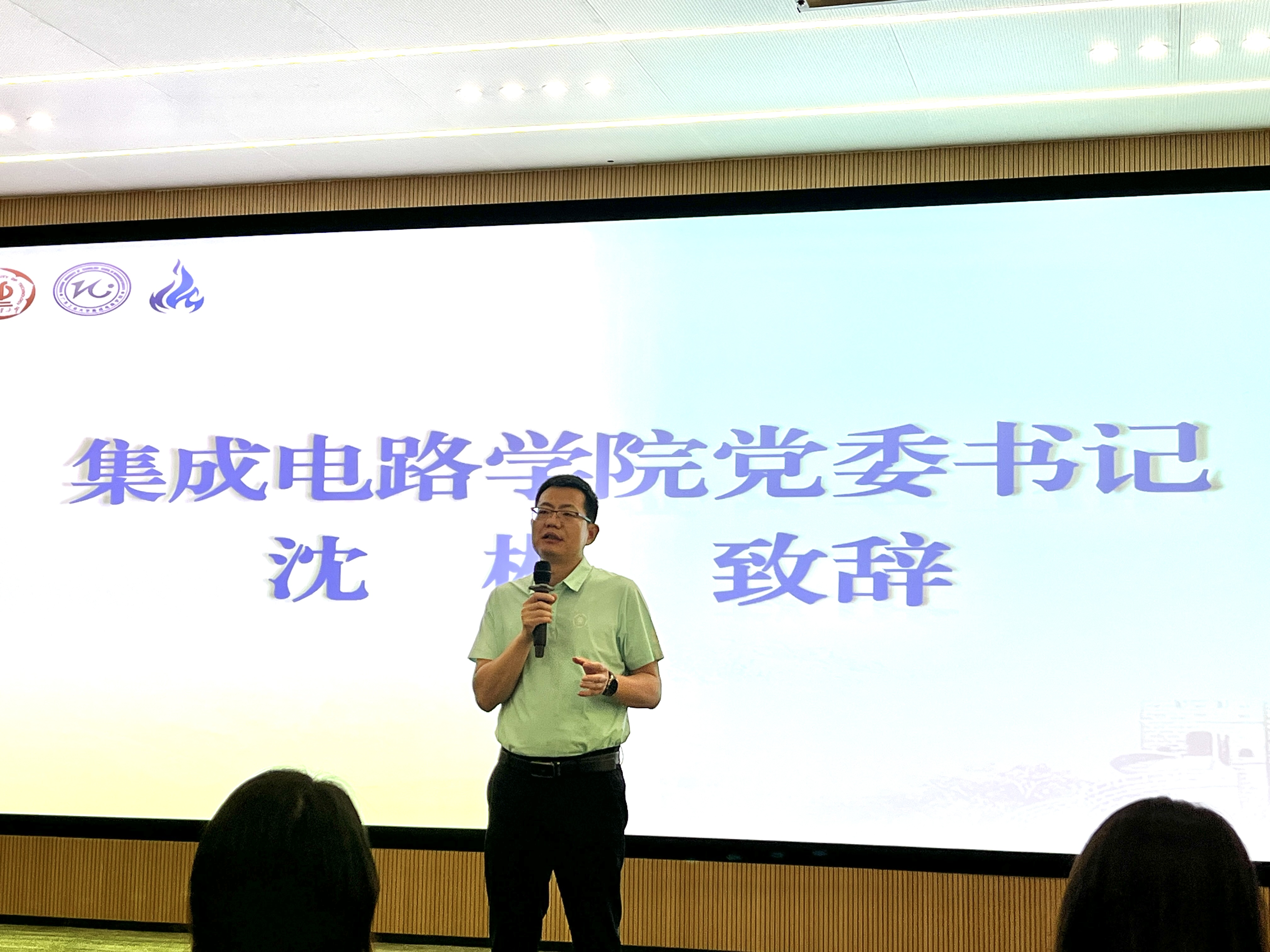 、学校、社会、企业沟通获取资源,为同学们提供更好的专业学习环境与资源;要锻炼文字写作、口头表达两大基本素质,能够将所思所想所行表达出来,落实到纸面、实处上。并为2022级集成1班学员代表邹锐同学授“芯火班”班旗。