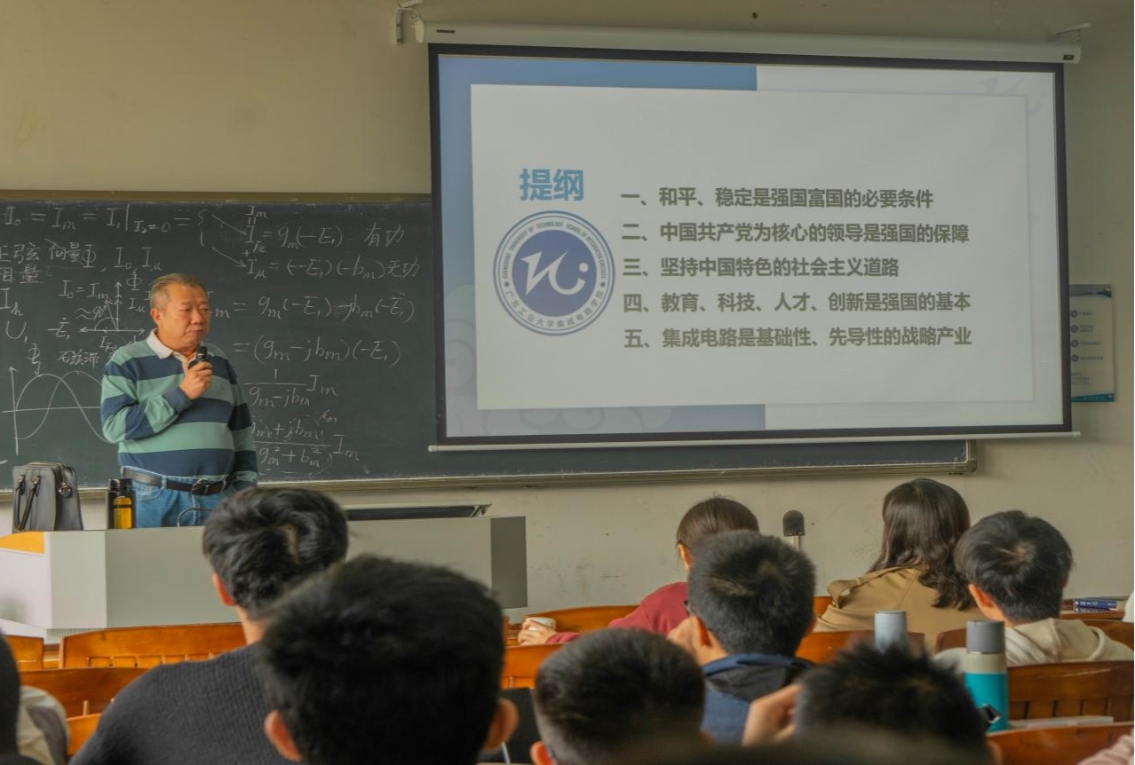 熊晓明院长以“坚持教育优先发展、科技自立自强人才引领驱动、加快建设强大的中国”为主题,结合当前国际形势,指出和平、稳定在强国富国中发挥的重要作用;同时围绕党和国家过去5年取得的巨大成就和新时代10年的伟大变革,分享自己的留学经历,分析了我国制度的优越性,强调教育、科技和人才在强国之路中的重要性,勉励同学们要夯实学科基础,争做创新型人才,为我国芯片产业贡献力量。
