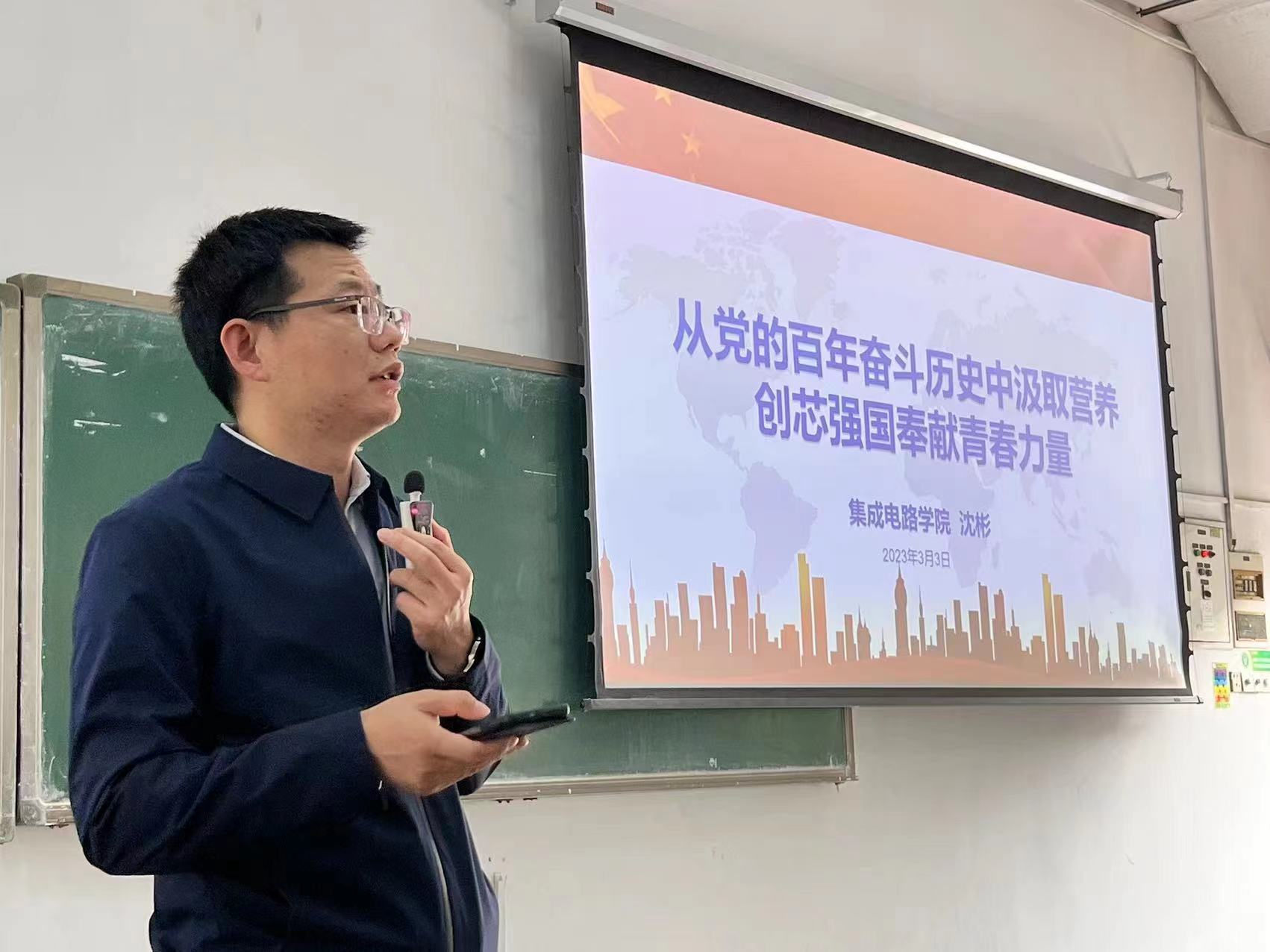 沈彬书记围绕“从党的百年奋斗历史中汲取营养 创芯强国奉献青春力量”这一主题,从当前国内外形势、党的百年奋斗历史、以及集成电路行业面临的困境与机遇三个方面展开分享。他以当前国际局势以及我国目前面临的挑战为切入点,带领同学们回顾了党的百年奋斗历程,深刻剖析了“中国共产党为什么‘能’”;结合时政热点分析了我国集成电路行业面临的现状,引导同学们牢记youjizz