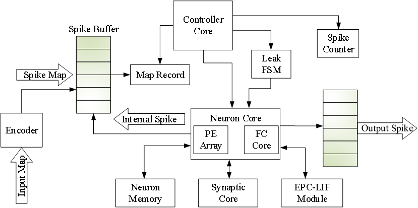 针对现有的脉冲神经元硬件的计算复杂度仍较高和精度不高,相应的神经形态系统无法支持各种具有不同卷积拓扑结构的SNN网络,系统效率偏低等问题,作者设计并实现基于FPGA平台(Xilinx Kintex-7)的改进神经元计算模块EPC-LIF和高效能的神经形态硬件加速系统ELIF-NHAS。一方面,通过采扩展预测校正(EPC)方法优化传统的LIF神经元,最大频率可达439.95 MHz,减少了神经元计算复杂度和硬件资源;利用遗传算法调整神经元的膜电位阈值,进一步提高SNN分类模型的准确性;另一方面,通过并行和四级管道技术,系统能有效支持SNN的快速推理,工作的最大频率为135.6 MHz,同时,通过FC core和PE array实现对具有不同拓扑结构的SNN网络的支持,包括MLP拓扑和CNN拓扑结构(SCNN,如传统卷积,深度分离卷积和残差卷积等)。六层SCNN在MNIST、Fashion-MNIST和SVHN数据集上的准确率分别达到99.10%、90.29%和82.15%;速度和能耗分别为到1.21ms/图像和1.19mJ/图像。与现有系统相比,ELIF-NHAS具有更高的速度和更低的功耗,更适合于SNN网络的部署和推理。