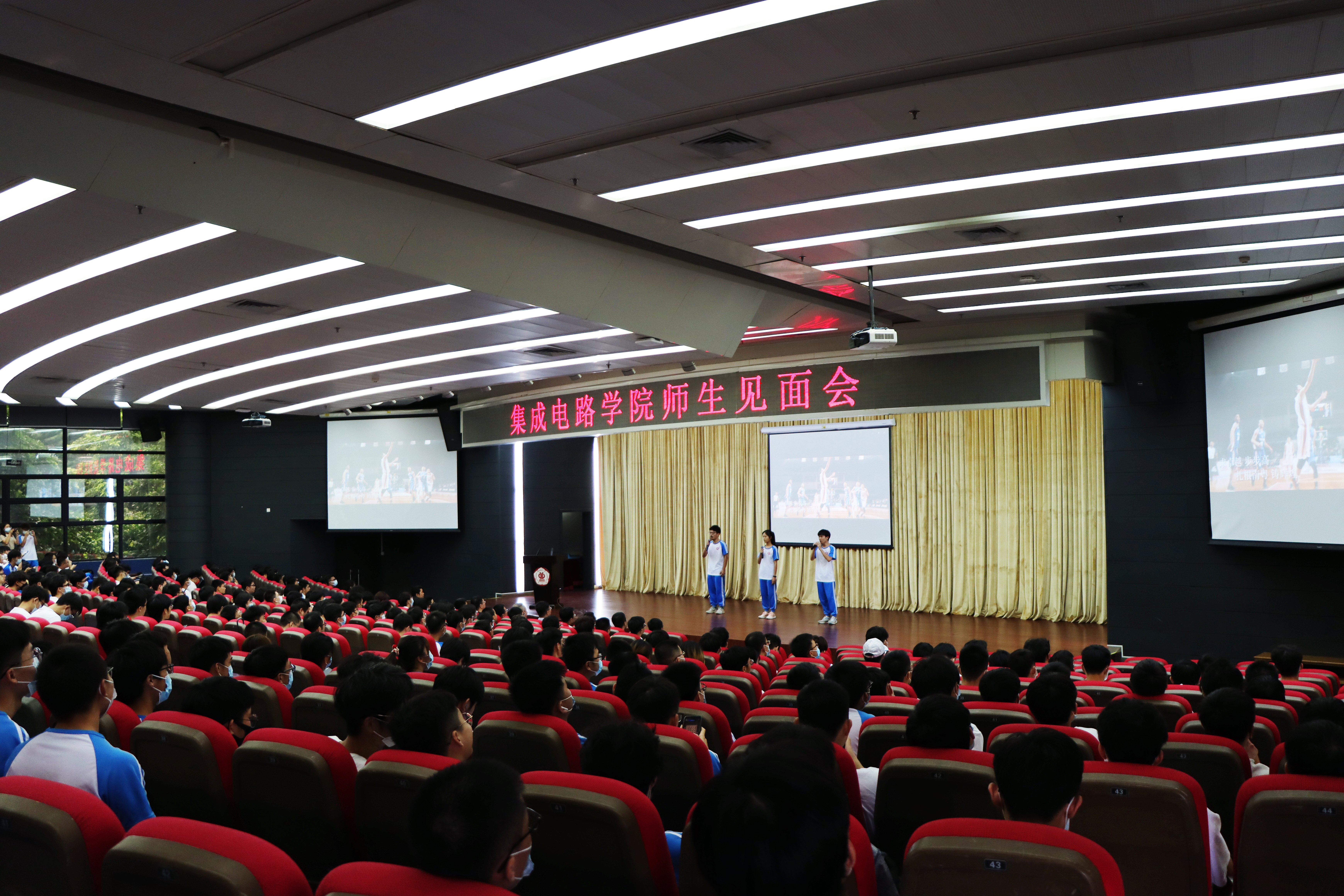 随着国歌响起,全体师生肃然起立奏唱国歌,拉开了师生见面会的帷幕。