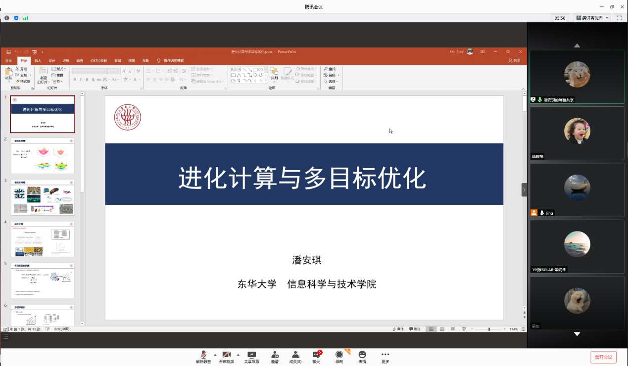 通过线上举行了题为《进化计算与多目标优化》报告与交流会。这次报告由潘安琪博士主持,参会人员有郭靖老师和团队部分相关方向的研究生。