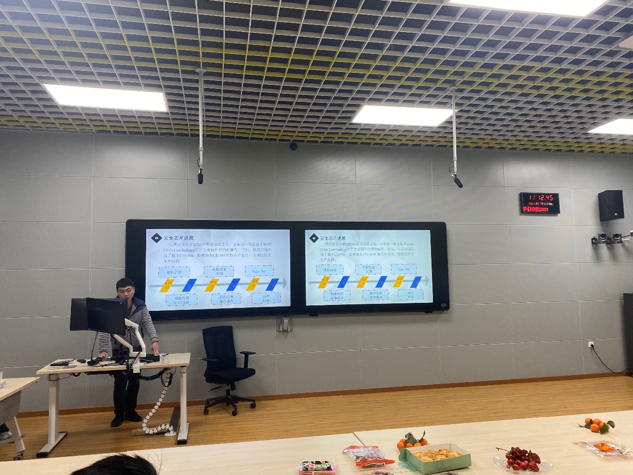 随后,2019级硕士研究生毕顺翔就信息安全在物联网中的应用向同学们做了专题分享,通过实际项目案例的讲解,介绍了信息安全的应用领域、PCIE加密卡的设计实现等技术。