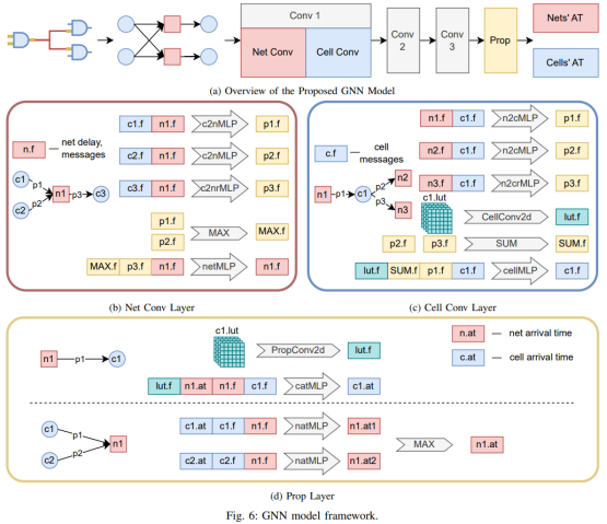 本文提出了一种基于图神经网络(GNN)的STA工具。与之前的研究相比,本文提出了一种新的将电路结构转化为图结构的方法,适用于时序分析问题,提升了GNN模型学习复杂电路结构的能力,利用时序弧和虚拟引脚预测布局阶段的线网延迟与到达时间等时序信息。在特征工程中,提出了NLDM差分化的方法,显著提升了模型的预测精度。同时,通过多任务学习策略,改进了DWA算法,提升了时序分析器对于不同预测目标整体的收敛性。最终,本文的方法在预测精度上显著优于近年来的先进工作,同时还有效减少了推理时间。