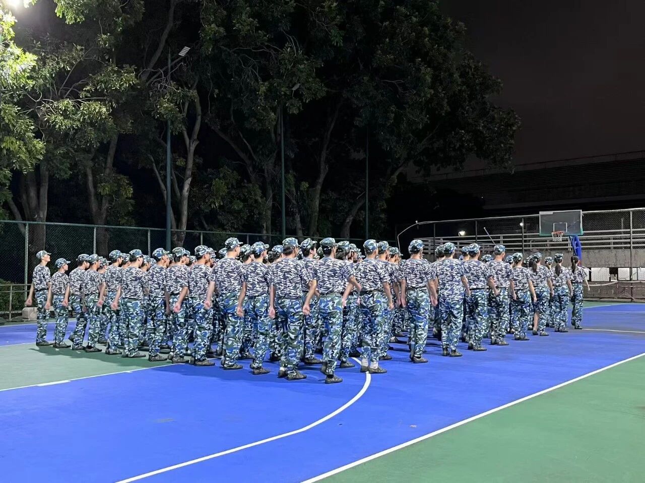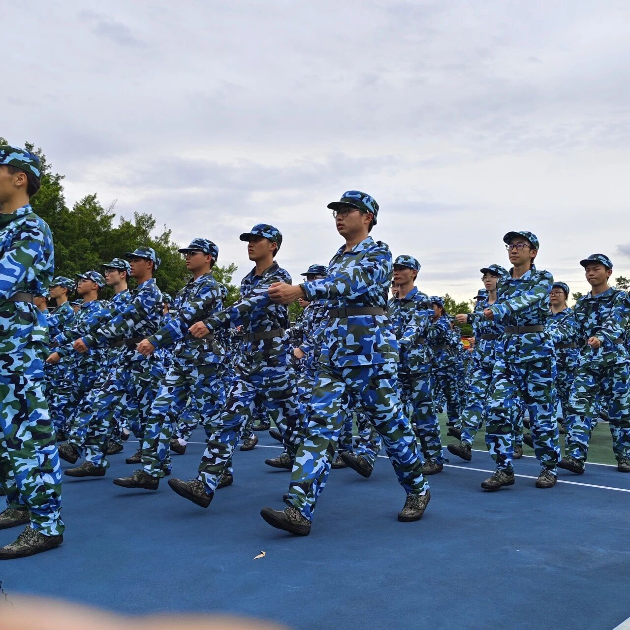 让我最难忘的是午后的队列训练。齐步走的“一二一”总也踏不齐,有人顺拐时,队伍里会迸出憋不住的笑声,又在教官严肃的目光里瞬间噤声。我们对着操场边的大树练摆臂,即使胳膊酸得抬不起来,也不肯放下,硬生生坚持了一秒又一秒;踢正步时脚腕磨得发红,大腿酸的发疼,晚上回到宿舍,大家互相帮忙拉伸,让自己的肌肉好受一些。练分列式很累,但没有人抱怨。军训的最后一天,夕阳把所有人的影子拉得很长,那天的晚霞特别红,映着我们汗湿的额发,竟比任何时候都好看。