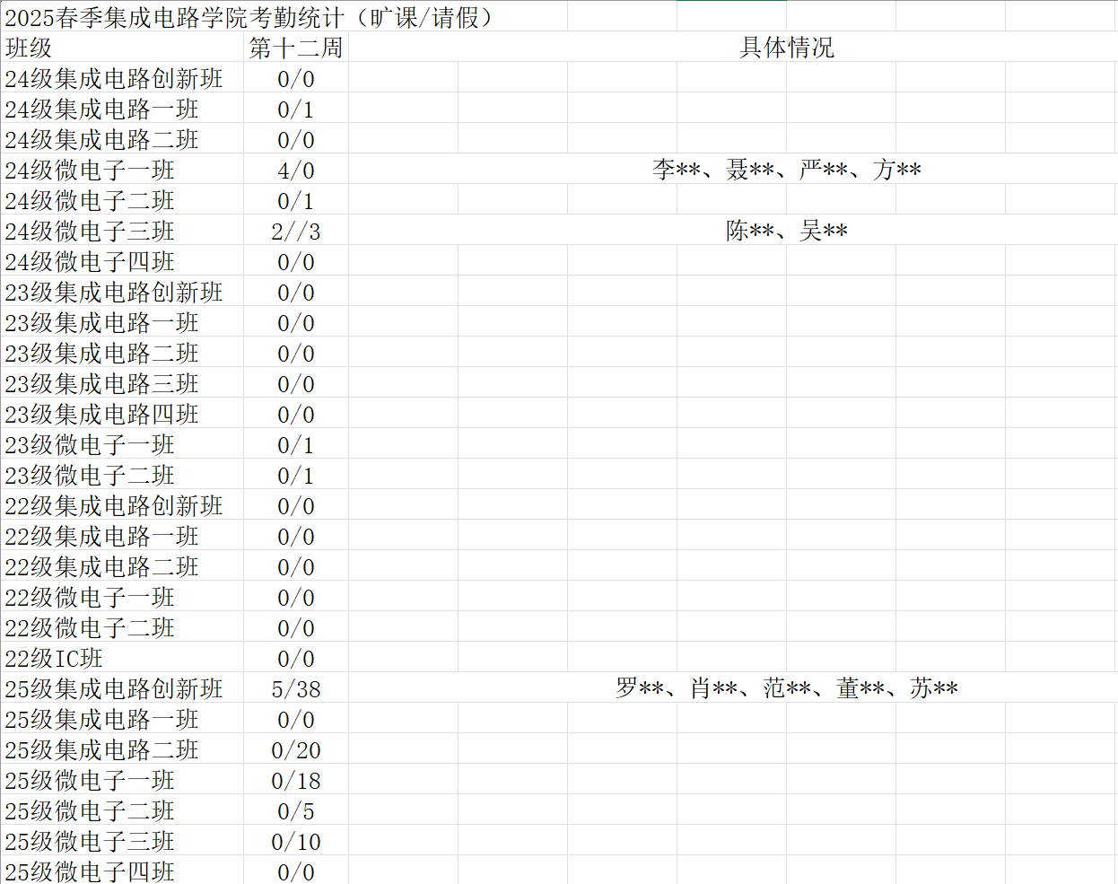 本次统计的是第12周的考勤情况,同学们的积极表现值得肯定和表扬。希望同学们保持良好学习习惯,积极学习。