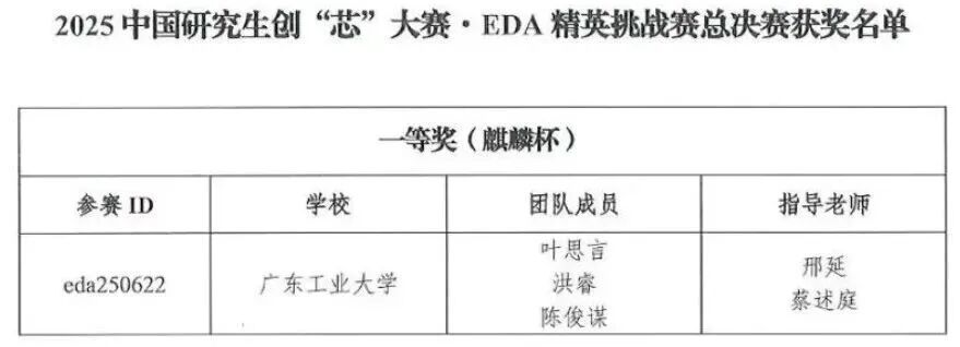紧扣学校人才培养“5I”新路径,长期坚持产教融合育人模式。学院与国产EDA龙头企业华大九天开展深度合作,通过共建实训基地,联合开展冬、夏训练营等方式,使学生提前接触并掌握产业级工具与真实工程问题。同时,学院依托EDA研发团队的科研优势,将前沿研究课题与竞赛方向紧密结合,形成了“科研反哺竞赛、竞赛驱动创新”的良性循环。未来,学院将继续深化产学研合作,为破解行业关键技术难题持续贡献广工智慧与力量。